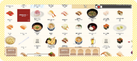 はい。商品メニューからカテゴリ別にご注文いただくこともできますし、すしナビの機能を使うことで直感的にご注文が可能です。