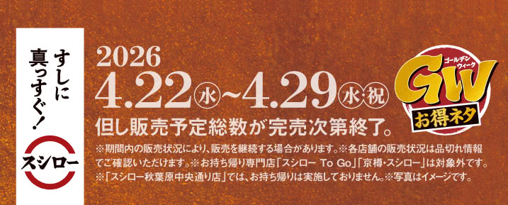 本キャンペーン期間中に、スシロー公式 X(旧Twitter)アカウント「@akindosushiroco」をフォローして、「GWお得ネタ」に関わる対象ポストをいいね&リポストしていただくだけで、抽選で30名様にお食事券1万円分が当たる! ▼X(旧Twitter)アカウントをお持ちの方 https://x.com/akindosushiroco ▼X(旧Twitter)アカウントをお持ちでない方 https://x.com/home?lang=ja